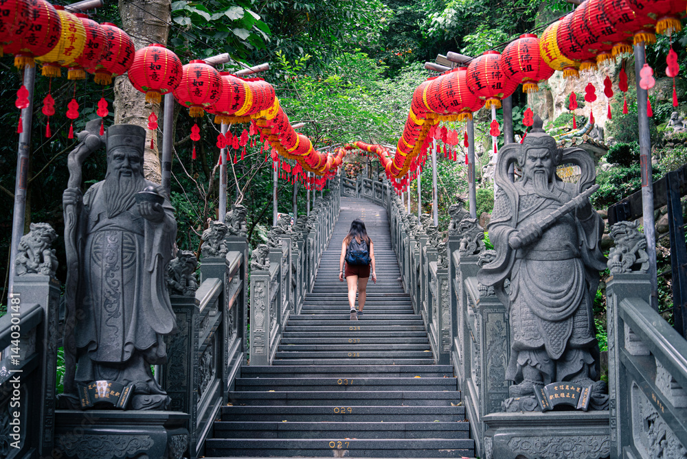 girl tourist walking up stairs to temple with red lanterns asia #1440301481