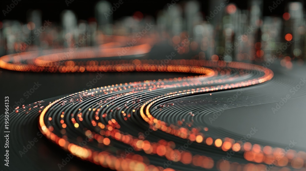 Glowing data streams move across a futuristic cityscape infrastructure #1950966133