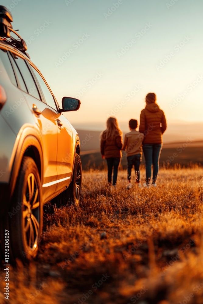 Golden sunset illuminates family walking in nature, car parked n #1376206057