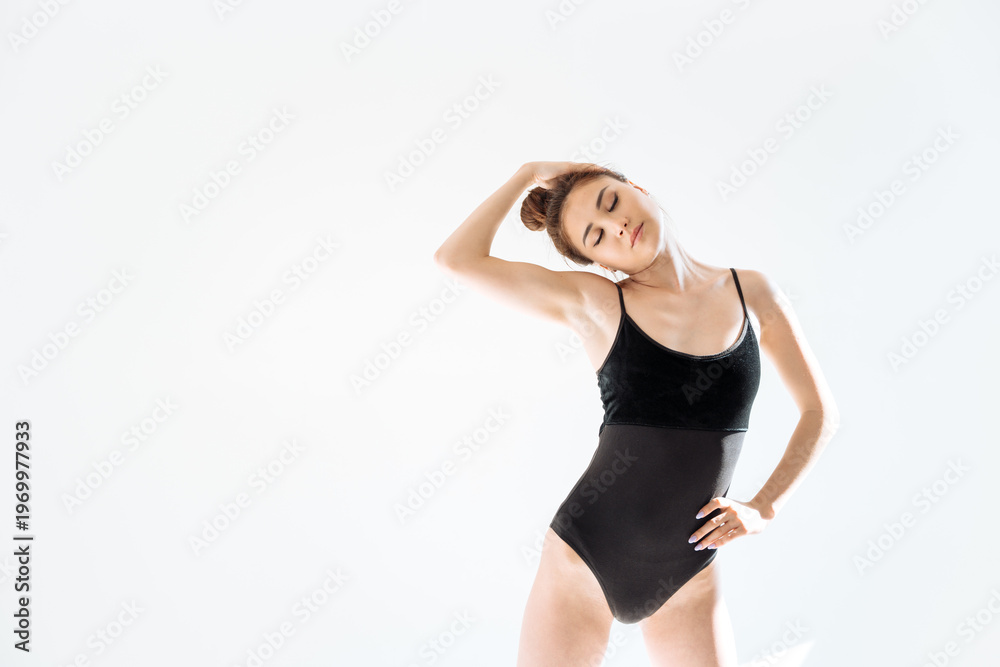 Graceful female model in a black leotard performing a neck stretch in bright natural light against a clean white background. Excellent for fitness, dance, flexibility and body awareness concepts. #1969977933