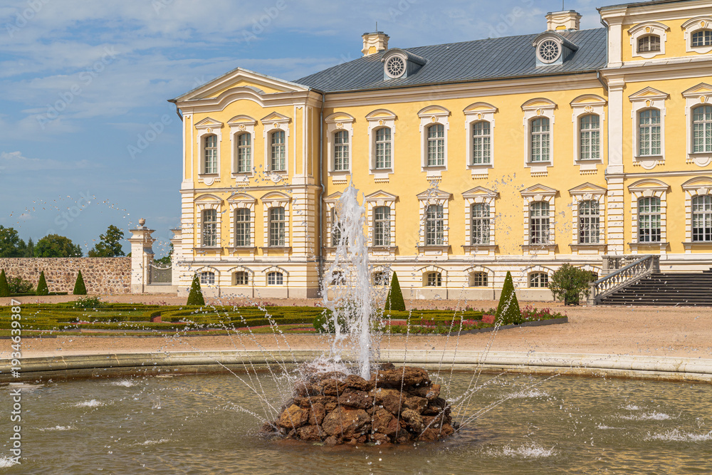 Grand yellow Rundale palace with classical architecture. Fountain jets water in center of stone pond. Symmetrical gardens frame the elegant structure. Sunny sky enhances the scene's calm elegance #1934639387