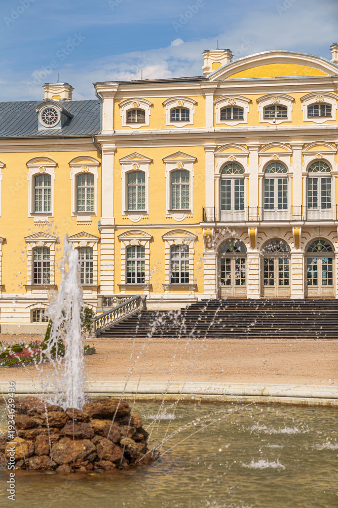 Grand yellow Rundale palace with classical architecture. Fountain jets water in center of stone pond. Symmetrical gardens frame the elegant structure. Sunny sky enhances the scene's calm elegance #1934639436