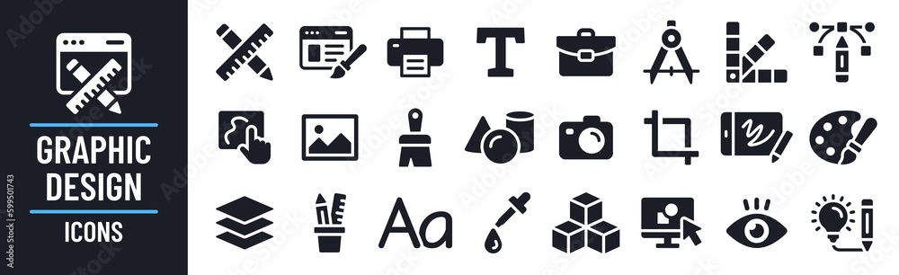 Graphic Design icon set. Containing web design, draw, illustration, portfolio, website, creativity, art, painting, print and more. Solid icons template vector collection. #599501743