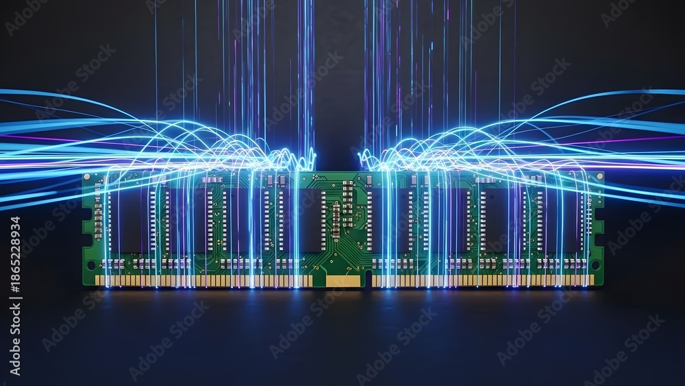 Green RAM memory module with vertical and horizontal glowing blue data lines showing high speed AI processing. #1865228934