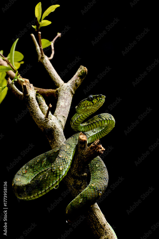 Green tree venomous snake with black background. It's a trimeresurus sumatranus. #1773958136
