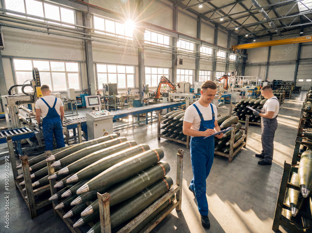 Group of factory workers in blue overalls working at artillery shell manufacturing plant. Industrial technicians checking quality of large ammunition in bright sunlit workshop. Defense industry. #1900962392