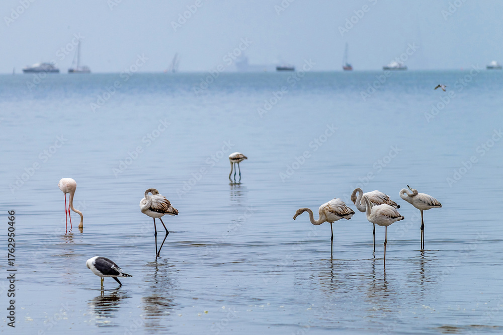 Groupe de flamants roses à Walvis Bay en Namibie #1762950466