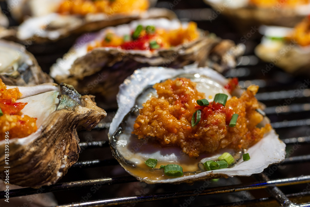 Guangzhou, Canton, China. close-up of grilled oysters topped with garlic, chili and scallions, traditional Chinese street food served hot on metal grill. #1781393496