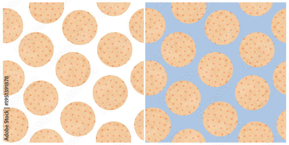 Hand‑Drawn Seamless Circle Patterns – Minimalist Vector Backgrounds with Big Polka Dots. Big Beige Biscuit Or Pizza-like Circles With Subtle Red Polka‑dot Accents On A White And Light Blue Background. #1951391878