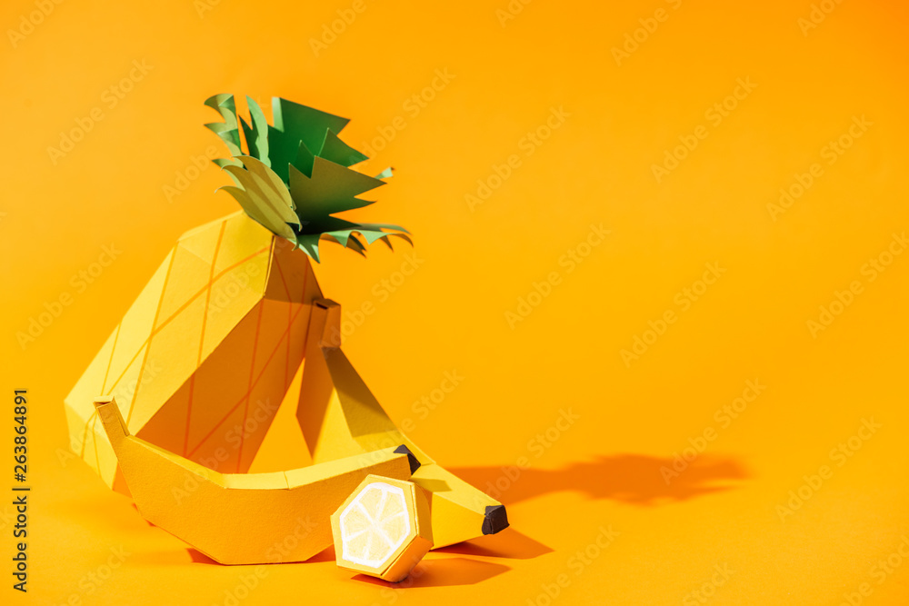 handmade paper pineapple, bananas and lemon on orange with copy space #263864891