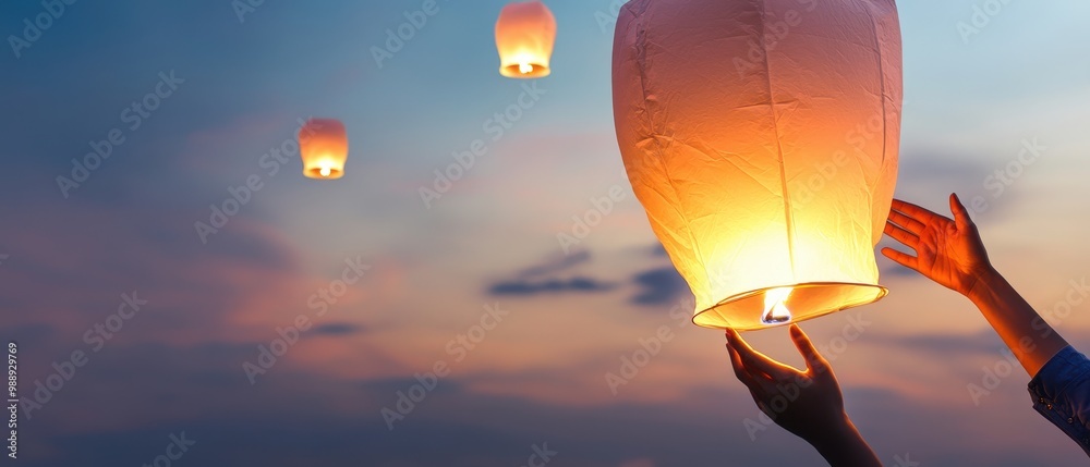 Hands release glowing lanterns into the twilight sky, creating a serene and magical atmosphere as they float gracefully upwards. #988929769