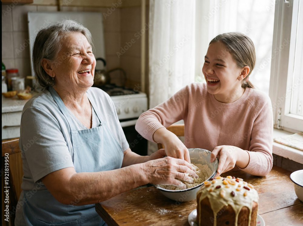 Happy grandmother and teenage girl laughing while kneading dough in large ceramic bowl in kitchen featuring traditional holiday bread on table for intergenerational family baking and lifestyle journey #1921819950