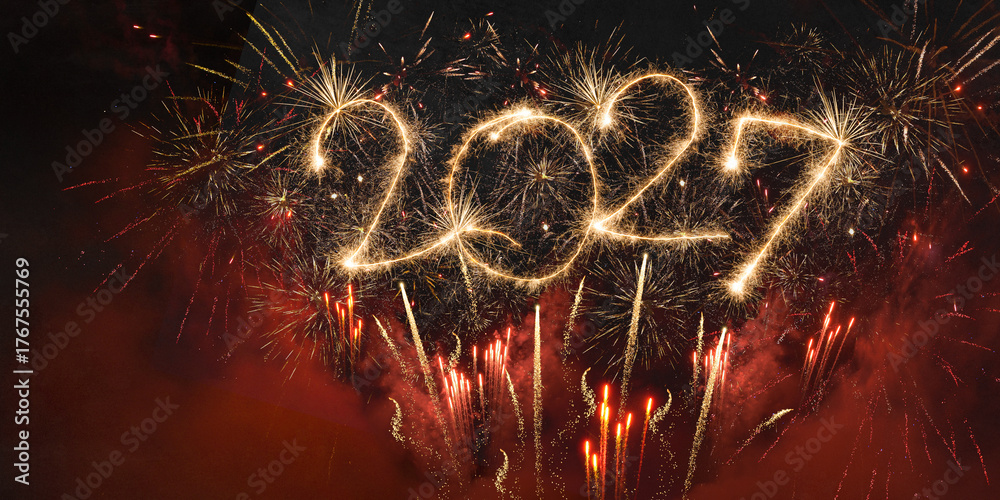 happy new year, new year's eve, silvester, new year, celebration greeting card, new year card - Year 2027 in sparkler font and firework fireworks pyrotechnic, isolated on black night sky background #1767555769