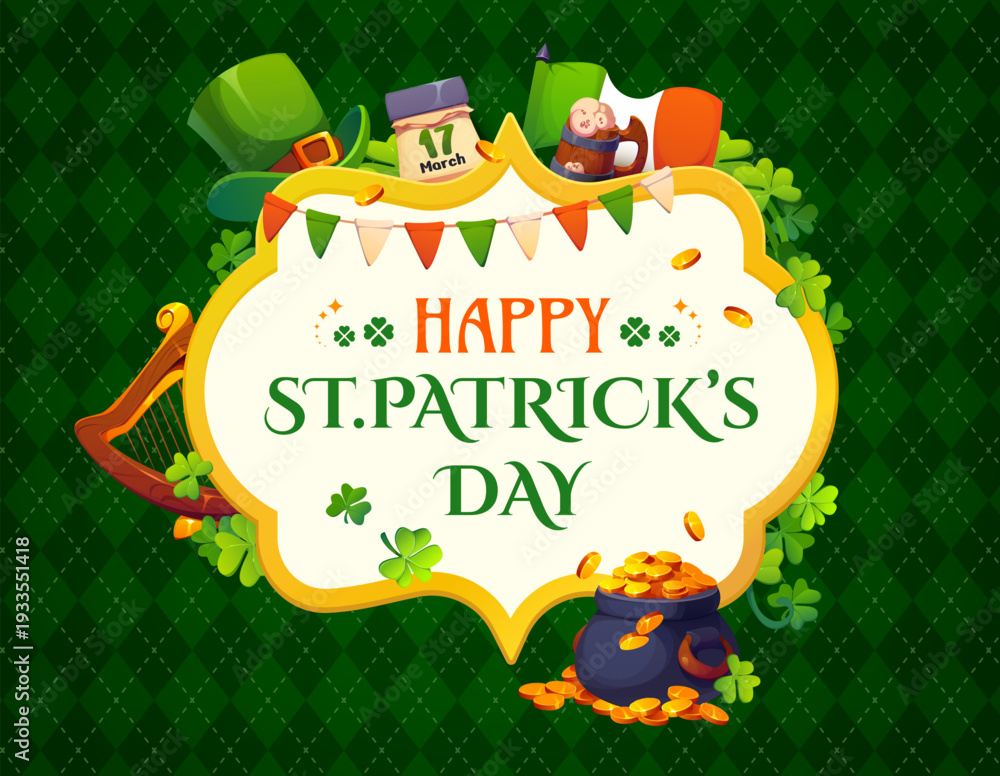 Happy St Patrick day greeting card. Cartoon vector holiday banner with leprechaun hat, calendar, gold coins, shamrocks, harp, beer mug, Irish flag, and festive garland on a green patterned background #1933551418