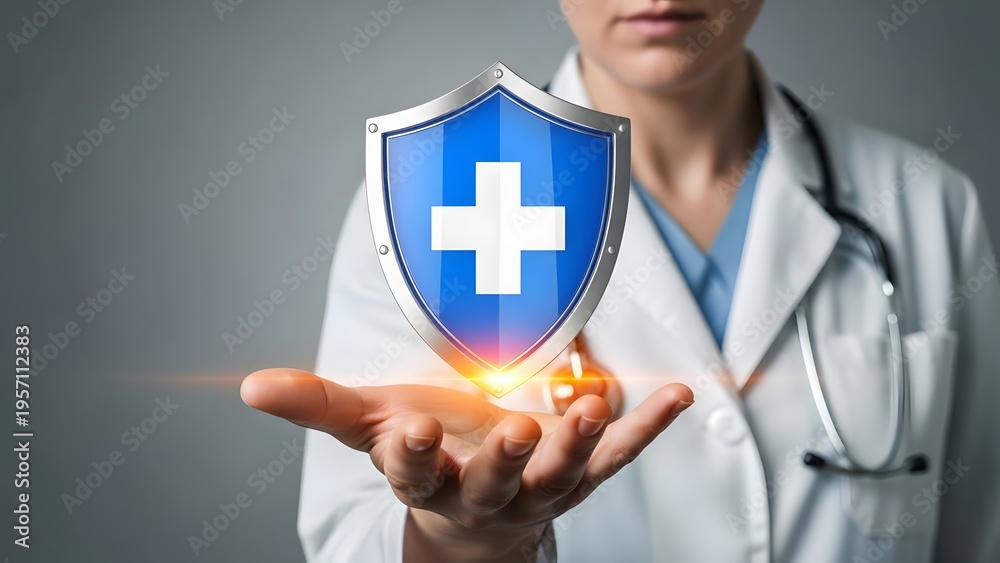 Healthcare professional, wearing a white lab coat and stethoscope, presents a shimmering blue shield with a white medical cross symbol. #1957112383