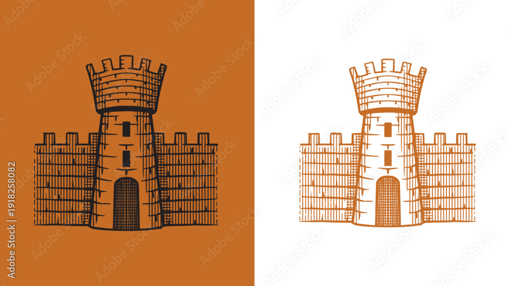 Heraldic tower with a gate of a castle for coat of arms design and shield. Hand drawn engraving in old traditional medieval style, modern made element for family symbols and logo templates #1918258082
