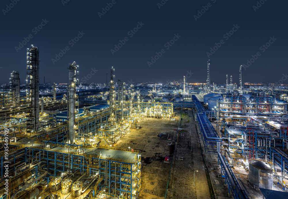 High angle view of a massive petrochemical refinery plant illuminated by bright lights at night. #1935440709