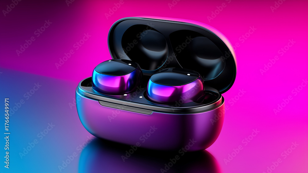 High-end wireless earbuds on reflective surface with ambient lighting, photorealistic #1766549971