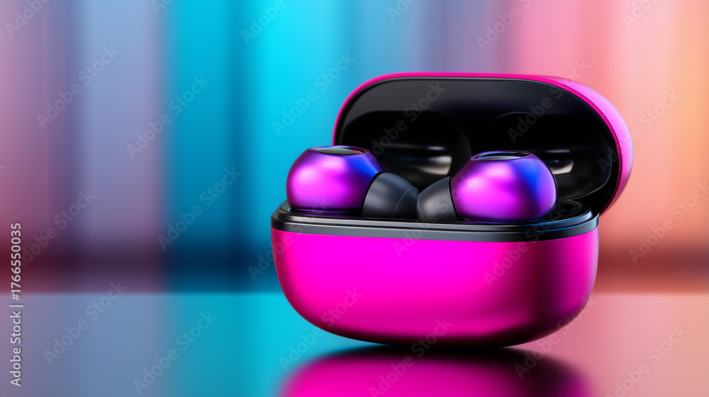 High-end wireless earbuds on reflective surface with ambient lighting, photorealistic #1766550035