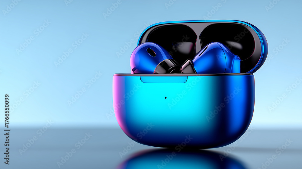 High-end wireless earbuds on reflective surface with ambient lighting, photorealistic #1766550099