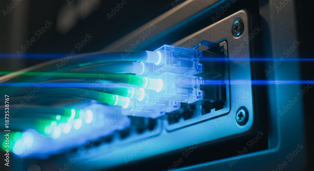 High Speed Data Transmission Closeup, Glowing Fiber Optic/Ethernet Cables Connected to Network Switch in Server Rack #1873538767