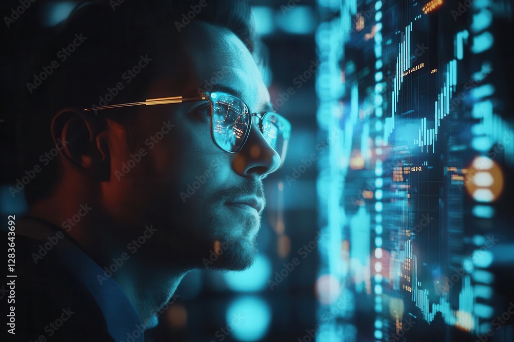 holographic financial data projections surrounding contemplative businessman glowing charts and graphs float in dark space with blue accent lighting #1283643692