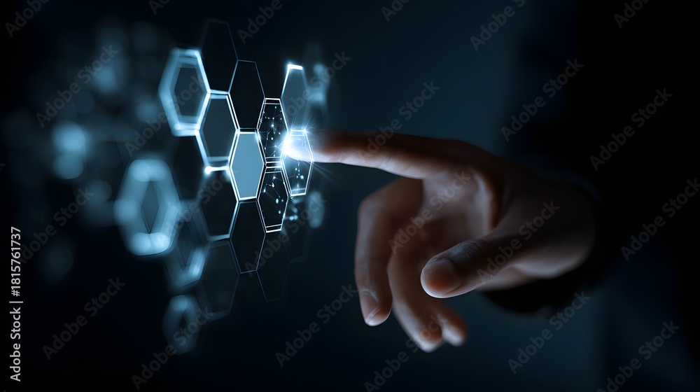 Human finger interacts with glowing hexagonal digital interface elements in darkness #1815761737