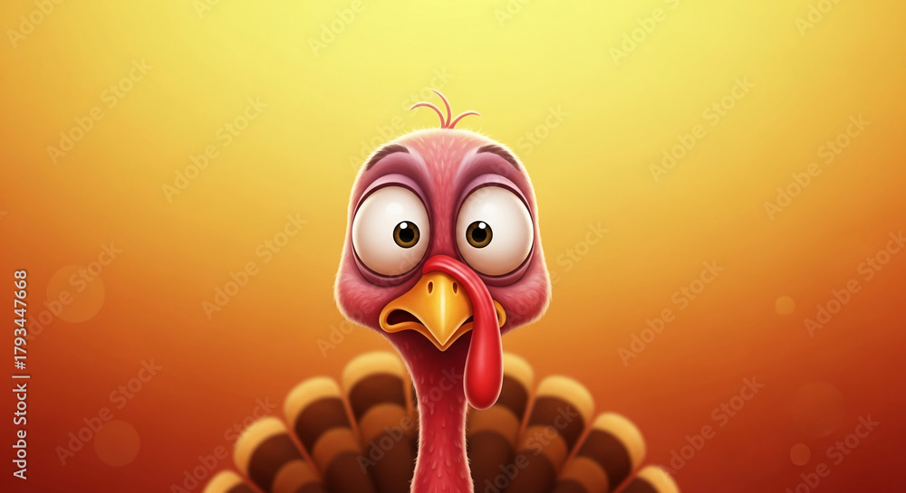 Illustration of a cartoon turkey with big eyes on a gradient orange background, representing Thanksgiving holiday and festive mood for celebration #1793447668