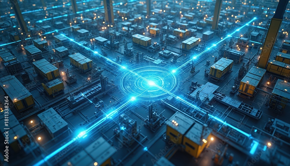 Illustration presents futuristic tech concept. Visualizes data flow within manufacturing facility. Digital network shows information transfer with sensor nodes. Industry tech, 5G network concept #1811338264