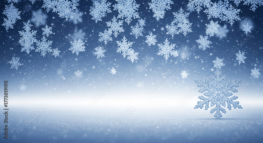 Image with blue snowflakes on a snowy surface, representing winter, cold, and holiday season, creating a peaceful and frosty atmosphere #1773019195