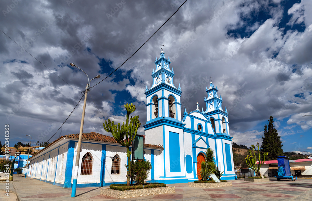 Immaculate Conception Church in Concepcion, Junin, Peru. The white and blue colonial-style building stands under a dramatic cloudy sky #1793348363