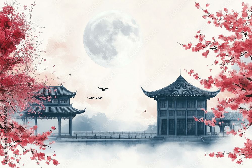 Ink wash painting with pagoda temple and foggy mountains. Chinese landscape with traditional architecture, lake and mist #1358964361