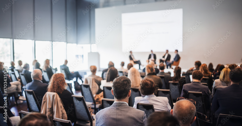 Interview and round table discussion at business convention and presentation. Audience at the conference hall. Business and entrepreneurship symposium. #1703435933