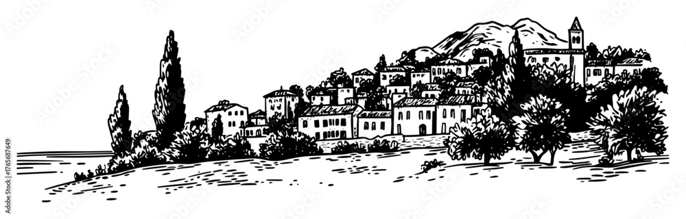 italian coastal town on a hill landscape sketch #1765687649