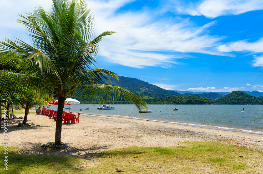 Jabaquara beach with umbrella and chairs in Paraty, Rio de Janeiro, Brazil. Paraty is a preserved Portuguese colonial and Brazilian Imperial municipality #1909398599