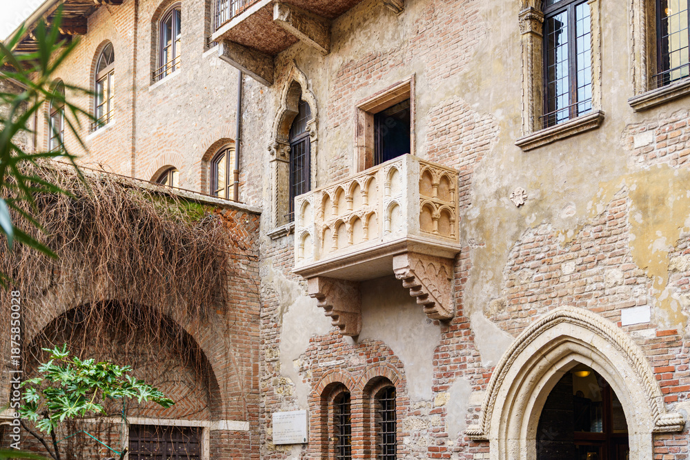Juliet's stone balcony in Verona, Italy The balcony is made of light red stone #1875850028
