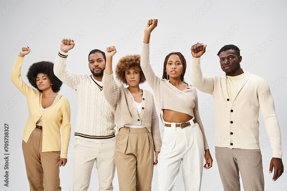Juneteenth and activism, happy african american people with clenched fists on grey background #705738327