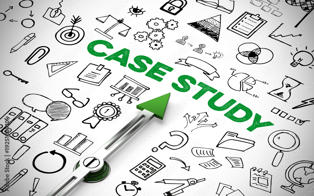 Kompass zeigt auf Schriftzug Case Study zwischen Icons als Business Konzept #1925188910