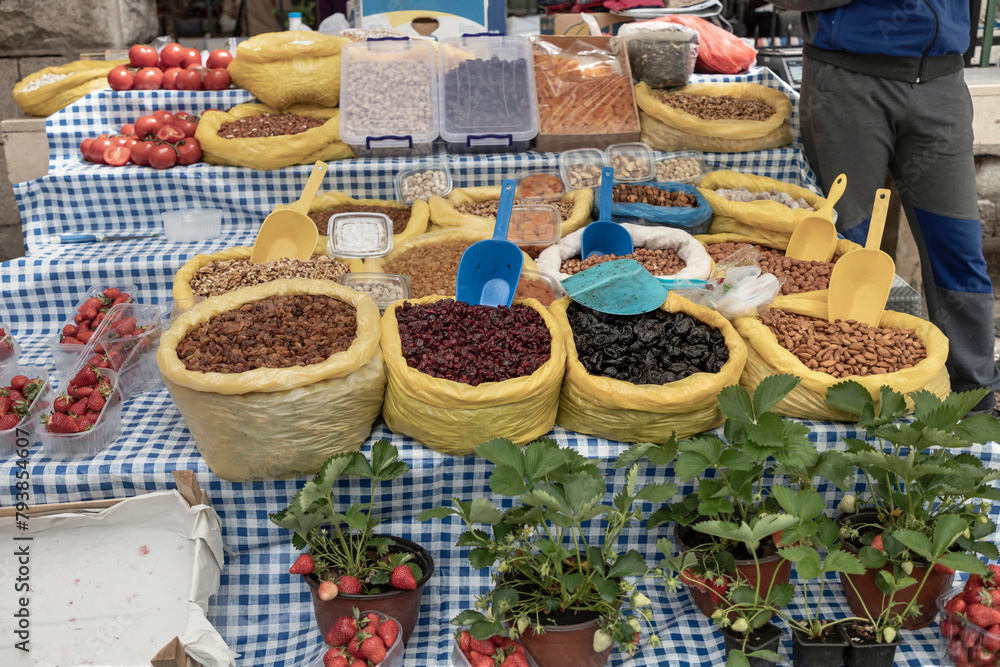 Kotor, Montenegro - Variety of strawberries, tomatoes, dried fruits and nuts displayed for sale at the local market stand #793854607