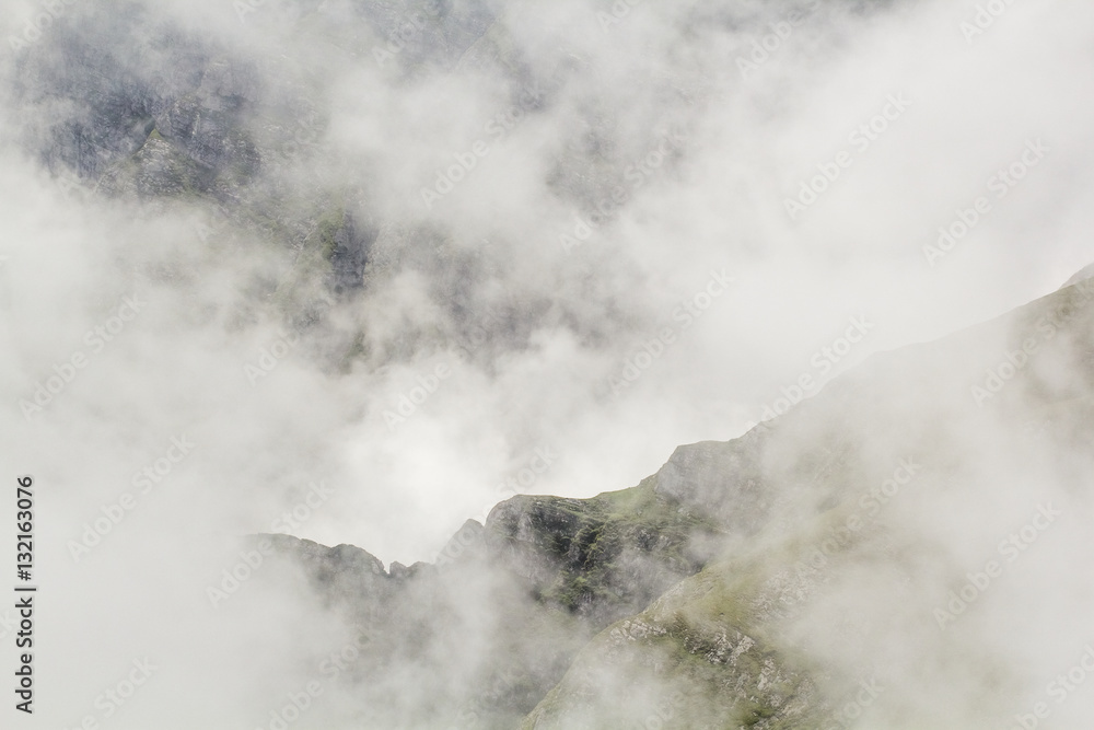 Landscape from Bucegi Mountains, part of Southern Carpathians in Romania in a very foggy day #132163076