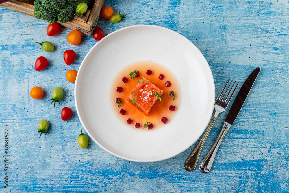 Layered tomato and beet terrine with herbs and seasoning #1768167217