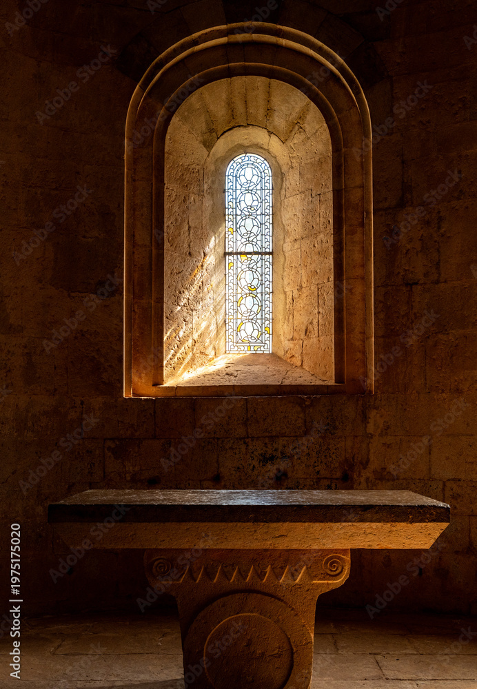 Le Thoronet Abbey interior, Provence-Alpes-Côte d’Azur, France : Romanesque window with sunlight illuminating stone altar in monastery #1975175020