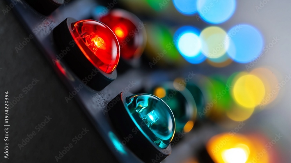 led indicator lights panel close up macro multiple colors red green blue yellow shallow depth of field #1974220394