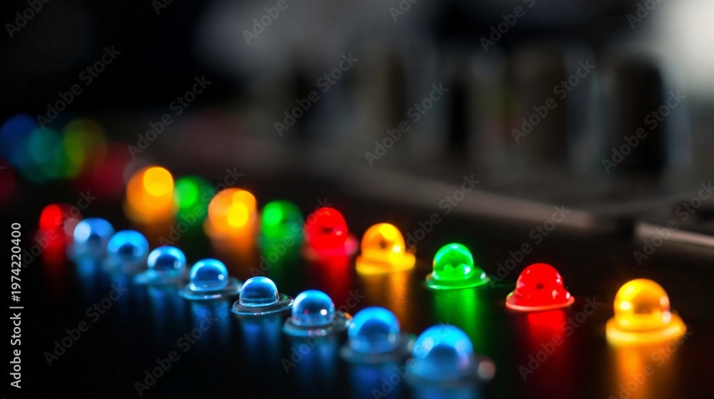 led indicator lights panel close up macro multiple colors red green blue yellow shallow depth of field #1974220400