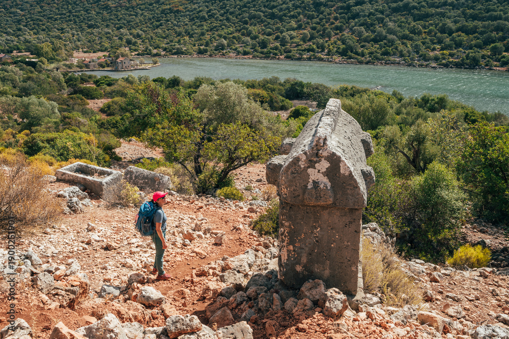 Lonely hiker woman walking net to Stone sarcophagus at ancient Simena Kaleköy city in Turkey. Mediterranean sea surrounded by rugged hills listed morning light. Archaeological treasure of Lycia. #1900251901