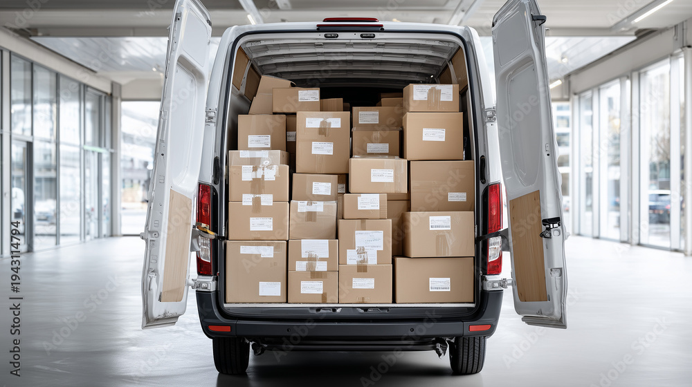 Looking into Back of Delivery Van Fully Stocked Organized Cardboard Parcels Packages#1943114794