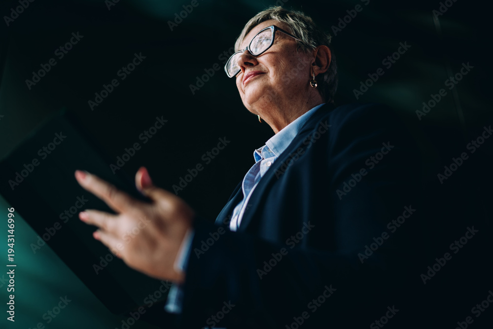 Low-angle view of senior woman holding tablet, looking determined. Strong visual message of modern leadership, authority, and digital confidence in a mobile world. #1943146996