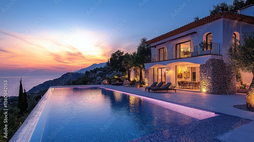 Luxurious mediterranean villa at sunset with infinity pool and scenic views #1380042153