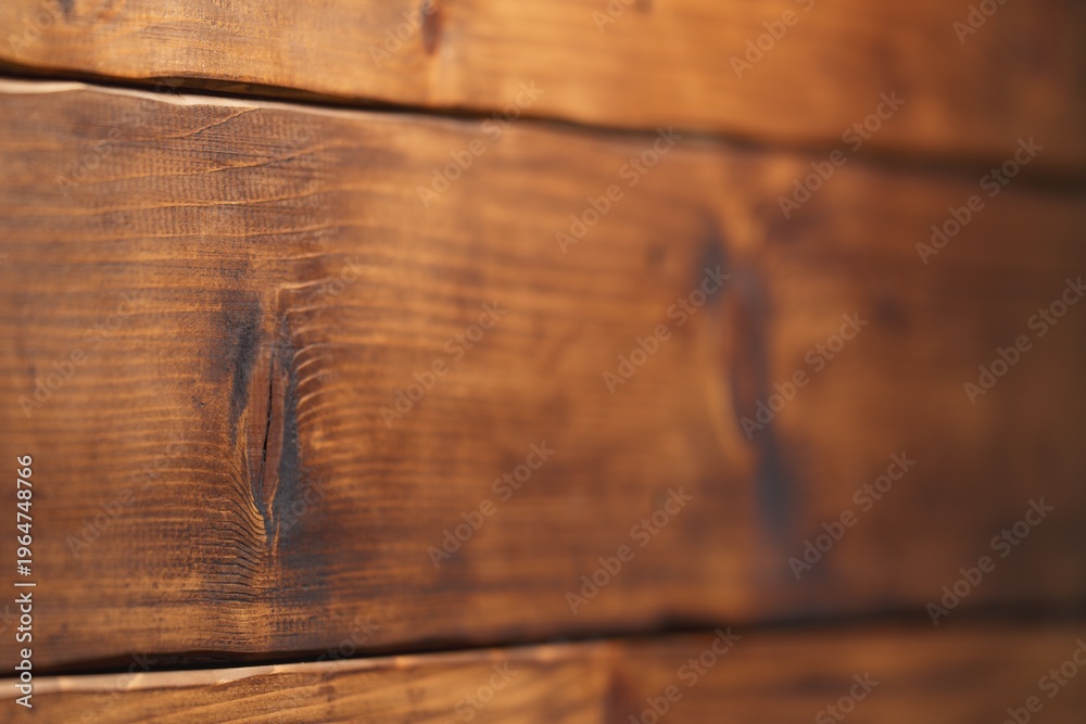 Macro photography of contrast grunge wooden wall with selective focus on weathered natural knotted wood part and wavy lines. Right side is softly blurred. Rustic backdrop with copy space. #1964748766