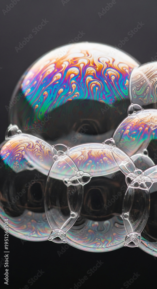 Macro shot of cluster bubble with iridescent pattern on dark backdrop, showcasing light interference effect. Concept: fragility, physics, or scientific study #1951260704